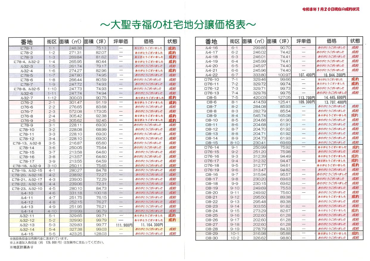 [概要]■所在地/加賀市大聖寺上福田町ロ8番1外 ■開発許可番号/石川県指令南加土地1957号(平成26年9月10日) ■開発面積/38749.27㎡(11721.65坪) ■総区画数/85区画 ■今回販売区画数/85区画 ■区画面積/202.60㎡/61.28坪(1区画)~572.08㎡/173.05坪(1区画) ■分譲価格/5,690,500円(1区画)~14,646,700円(1区画) ■最多販売価格帯/700万円台(20区画) ■用途地域/第1種中高層住居専用地域 ■地目/宅地 ■建ぺい率/60% ■容積率200%